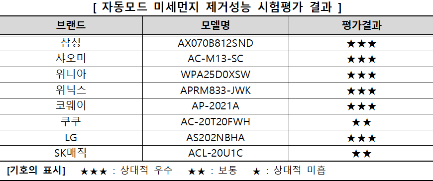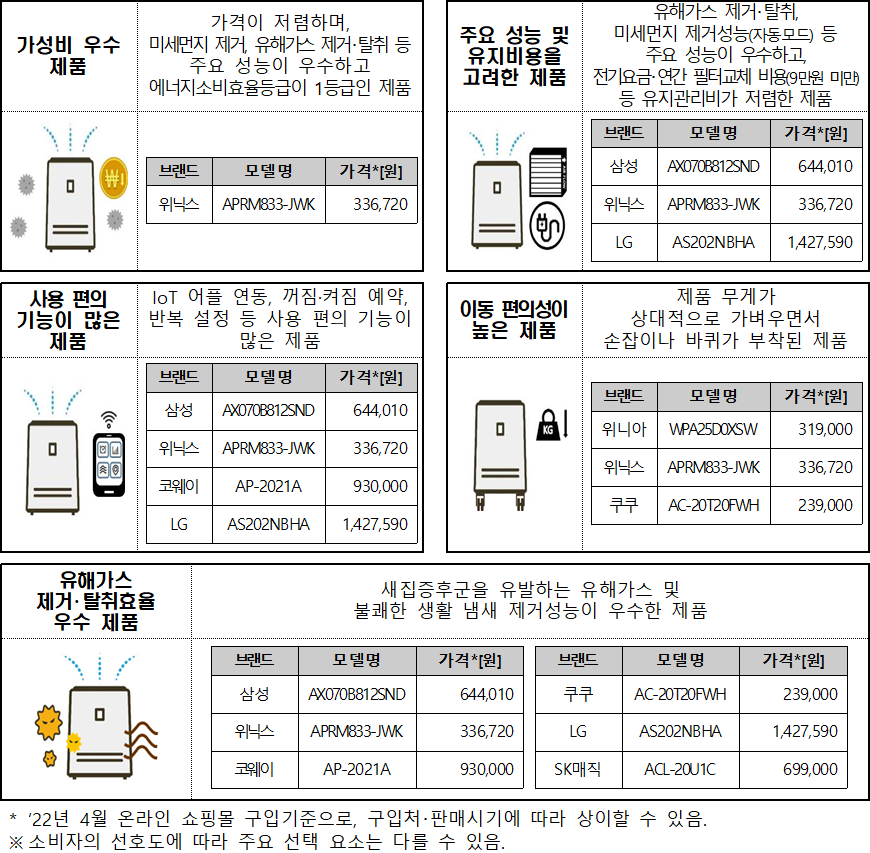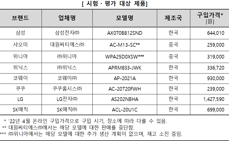 ※ 6개 제품 : 삼성 (AX070B812SND), 위닉스 (APRM833-JWK), 코웨이 (AP-2021A), 쿠쿠 (AC-20T20FWH), LG (AS202NBHA), SK매직 (ACL-20U1C)