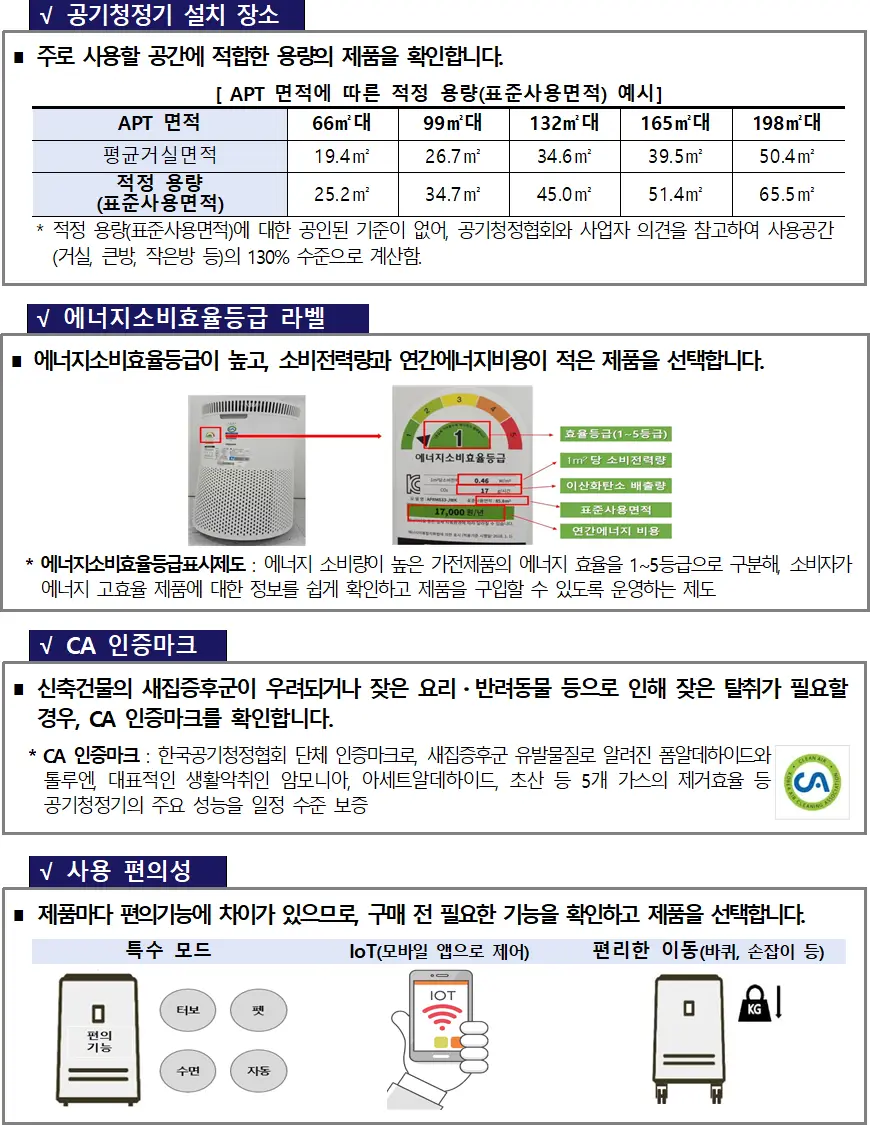 공기청정기를 선택할 때 제품 가격, 유지관리 비용 등의 경제성과 더불어 제품을 사용할 때 소비되는 전력량에 상당하는 이산화탄소 배출량 (산출값), 에너지소비효율등급 등의 환경성도 주요 고려 요소임.