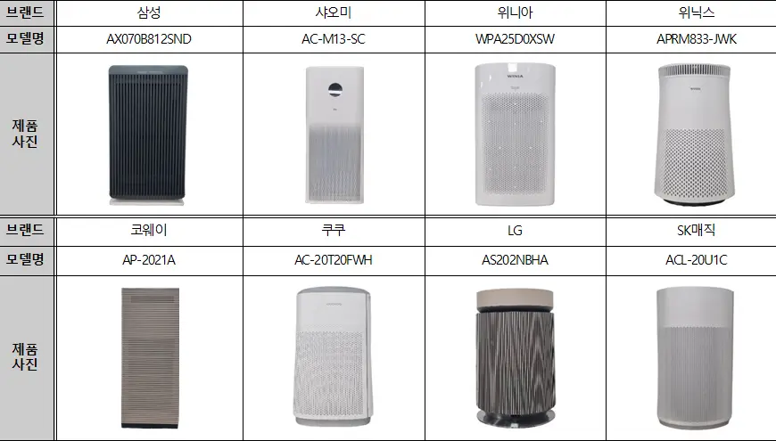 ※ 삼성 (AX070B812SND), 샤오미 (AC-M13-SC), 위니아 (WPA25D0XSW), 위닉스 (APRM833-JWK), 코웨이 (AP-2021A), LG (AS202NBHA)