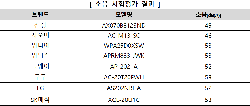 ② 정격풍량 (최대풍량)으로 운전 시 발생하는 소음을 측정한 결과, 모든 제품이 55dB(A) 이하로 관련 기준을 충족했고, 제품별로는 표준사용면적이 가장 작은 샤오미 (AC-M13-SC) 제품이 46dB(A), 나머지 7개 제품은 49dB(A) ~ 53dB(A) 범위 수준이었음.