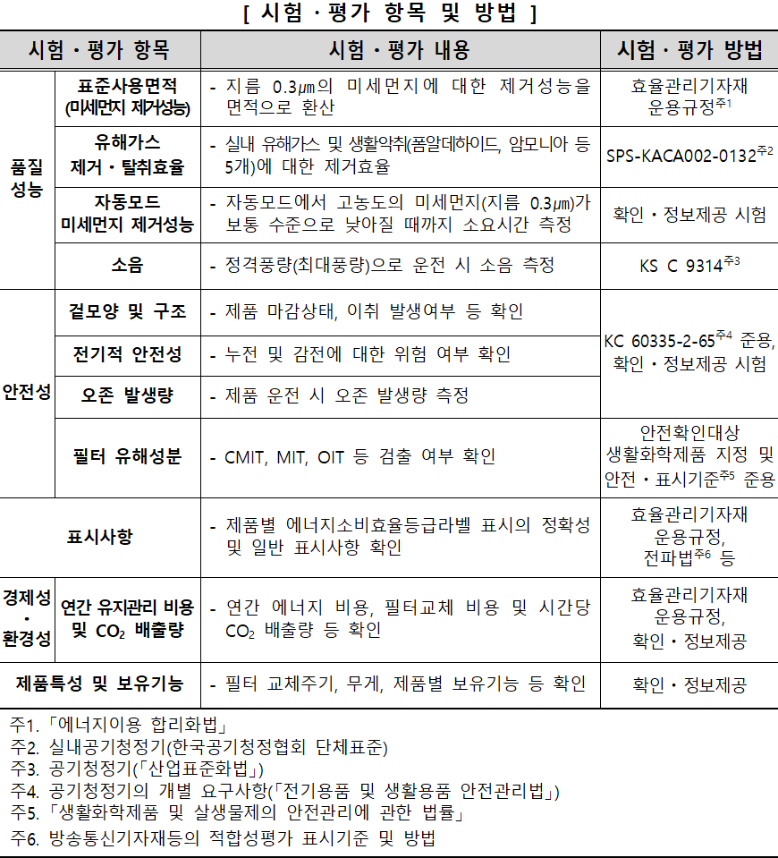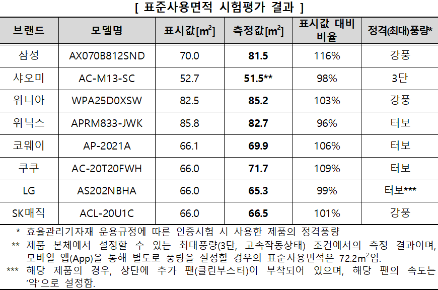 ② 지름 0.3㎛ 크기의 미세입자 1 × 108 ~ 3 × 108개/m3가 존재하는 시험챔버 (약 30m3) 에서 공기청정기를 정격풍량 (최대풍량)으로 20분간 운전 후 제거된 미세입자의 농도를 측정해 표준사용면적을 산출한 결과, 모든 제품이 관련 기준 (표시값의 90% 이상)을 충족했음.