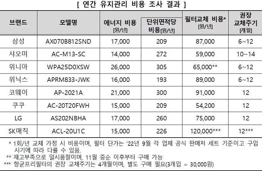 – 제품별로 필터의 권장 교체주기는 최소 6개월 ~ 최대 14개월로 차이가 있었으며, 1년에 1회 교체 시 쿠쿠 (AC-20T20FWH) 제품이 54,200원으로 가장 저렴했고, SK매직 (ACL-20U1C) 제품은 120,000원으로 가장 비싸 최대 2.2배 차이가 있었음.