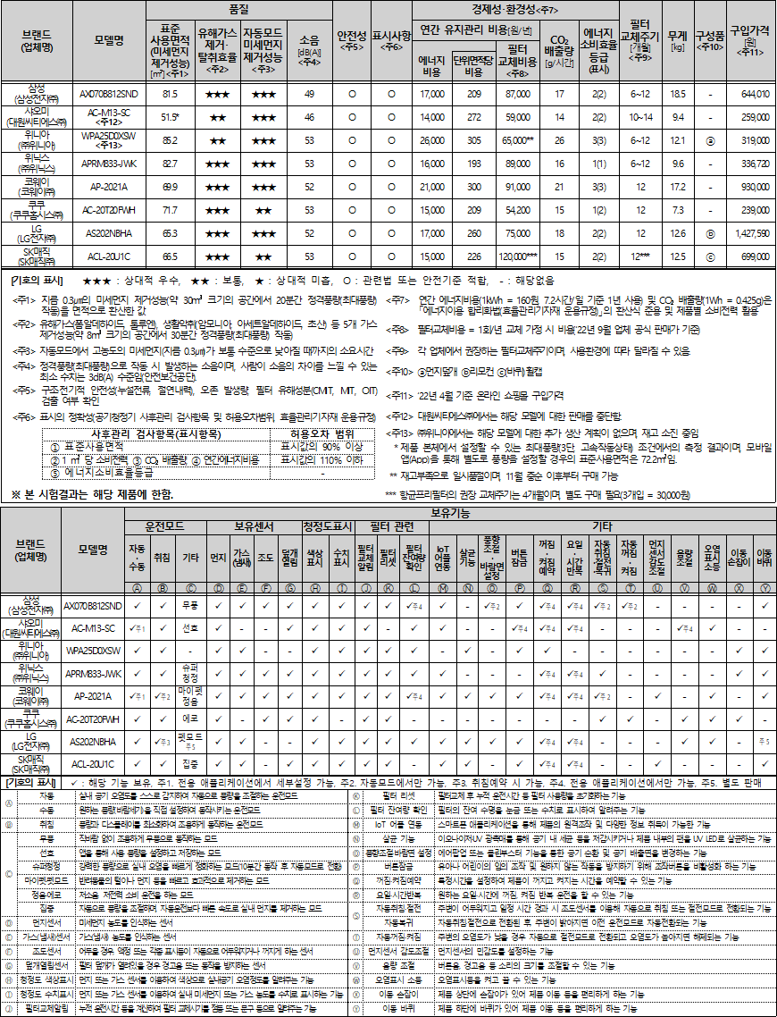 ※ 유해가스 제거, 탈취효율, 자동모드 미세먼지 제거성능, 소음 등