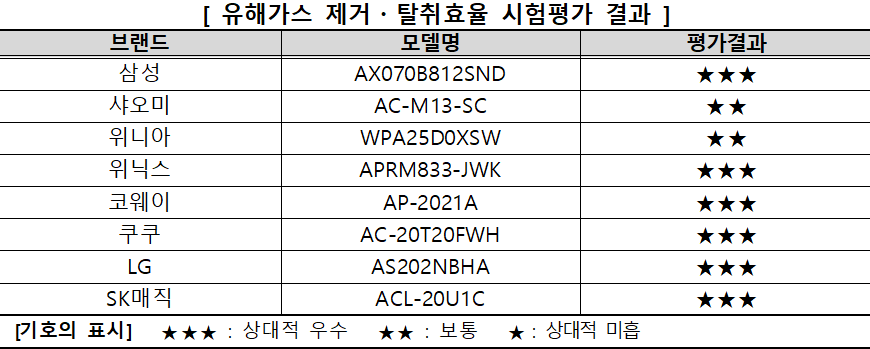※ ʻ보통ʼ 수준으로 평가된 2개 제품 중 샤오미 (AC-M13-SC)는 5개 가스 제거율간 최대 편차가 52% 수준이었고, 위니아 (WPA25D0XSW)는 생활악취와 관련된 아세트알데하이드의 제거율이 상대적으로 낮아 최대 편차가 72%로 컸음.