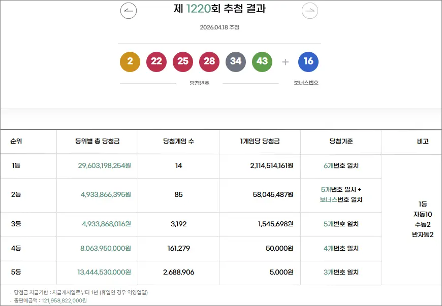 • 2. 로또 1220회 당첨번호, 당첨금액