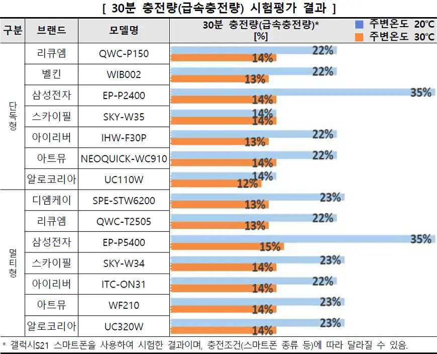 ※ 시험평가 무선충전기 제품의 평균 30분 충전량은 20℃ 23%, 30℃ 14%임.