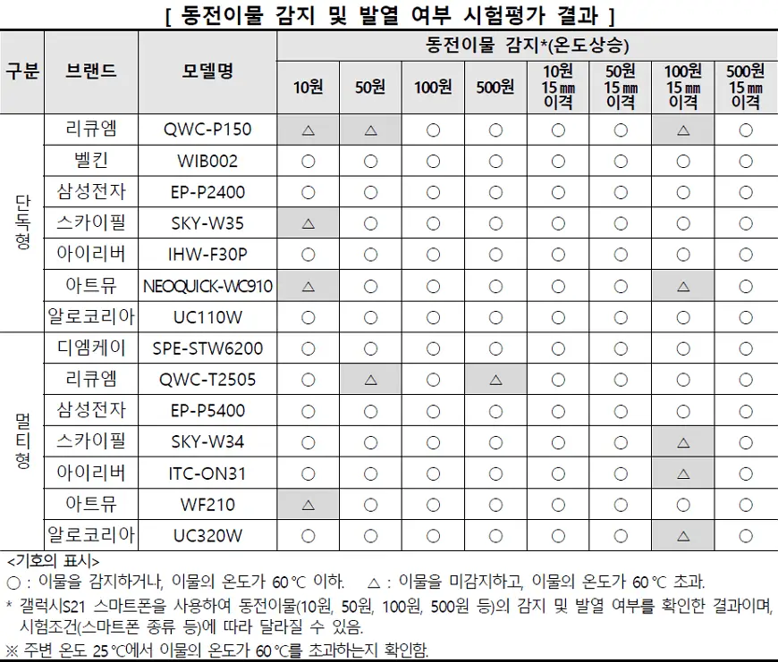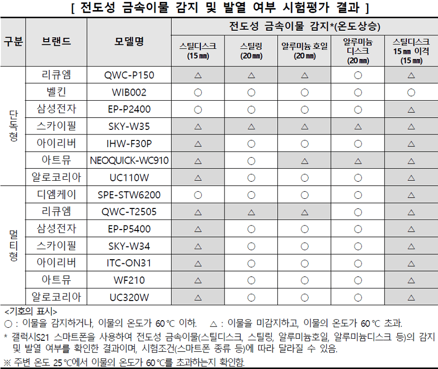 전 제품이 일부 이물을 감지하지 못하고 충전이 진행됨에 따라 이물 온도가 상승했으나, 벨킨 (WIB002), 삼성전자 (EP-P2400, EP-P5400), 아이리버 (IHW-F30P), 알로코리아 (UC110W), 디엠케이 (SPE-STW6200) 등 6개 제품은 동전 온도가 60℃ 이하로 온도상승이 제한적이었음.