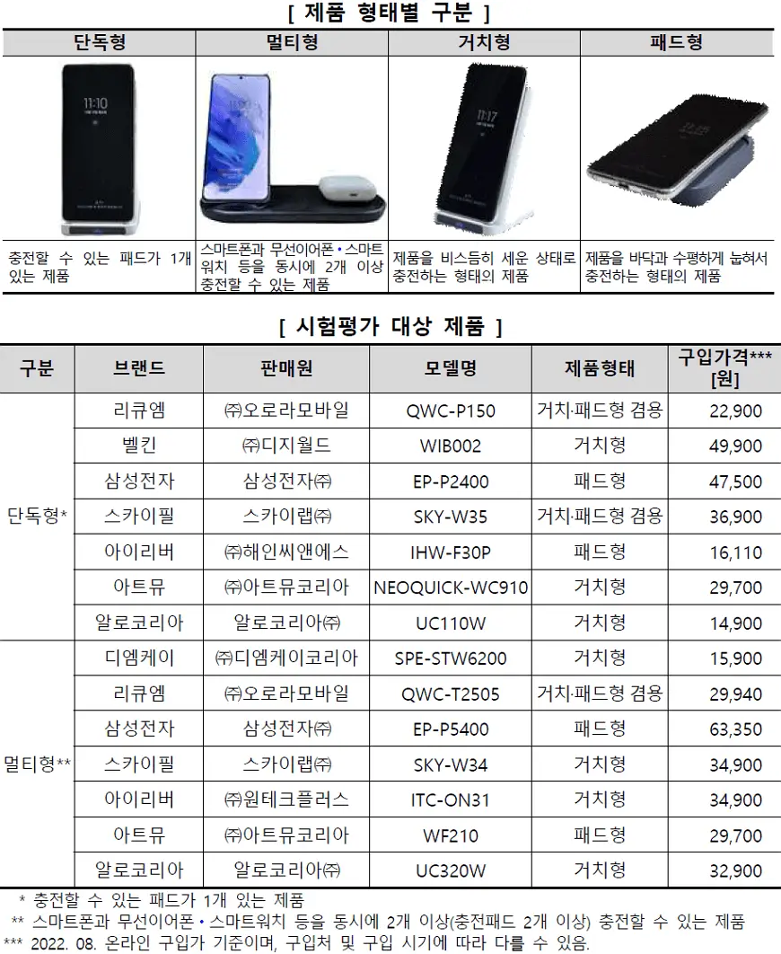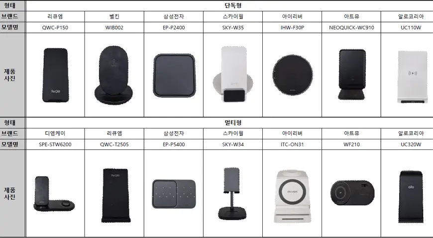 리큐엠 (QWC-T2505), 삼성전자 (EP-P5400), 알로코리아 (UC320W) 등 3개 제품은 무선이어폰, 갤럭시워치의 충전이 가능했음.