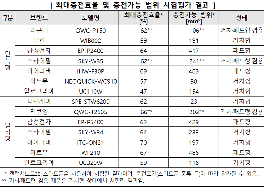스마트폰 (갤럭시노트20) 충전 시 실제 충전이 가능한 면적 범위는 23㎟~489㎟ 수준으로 제품 간에 차이가 있었고, 패드형이 거치형 제품에 비해 충전가능 범위가 넓었음.