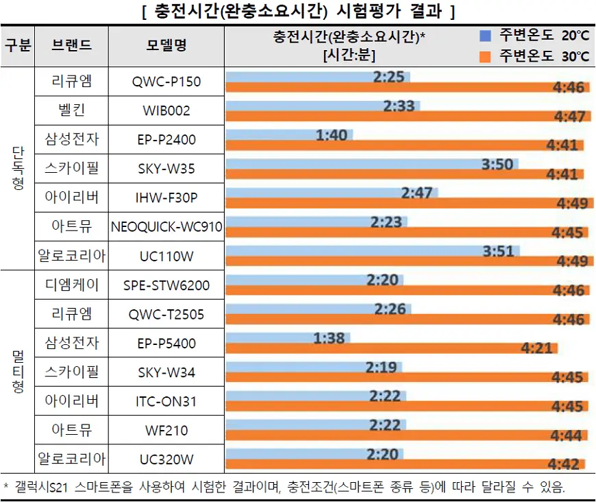 ※ 시험평가 무선충전기 제품의 평균 충전시간은 20℃ 2시간 31분, 30℃ 4시간 43분임.