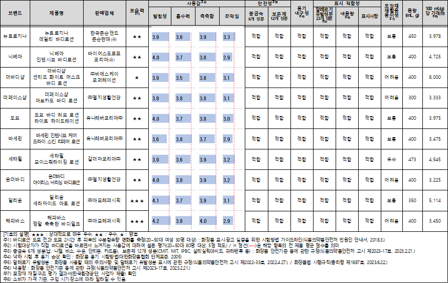 시험 결과, 바디로션의 보습력은 제품에 따라 차이가 있었으나 사용감은 차이가 크지 않았다. 중금속, 보존제 등은 안전기준을 충족했고 제품 100mL 당 가격은 최대 2.5배 정도 차이가 있었다. 포장재 재활용 용이성은 재활용 우수 등급 1개 제품을 제외한 나머지 제품 모두 보통 이하 등급인 것으로 나타났다.