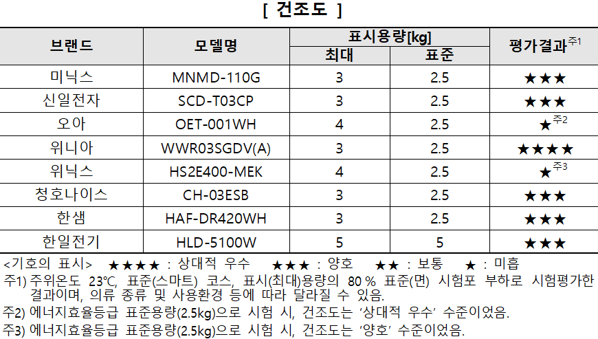 ※ 미닉스 (MNMD-110G), 신일전자 (SCD-T03CP), 청호나이스 (CH-03ESB), 한샘 (HAF-DR420WH), 한일전기 (HLD-5100W) 등 5개 제품은 티셔츠 등 일반적인 의류의 건조가 잘 되는 수준으로 건조도가 ʻ양호ʼ 했음.
