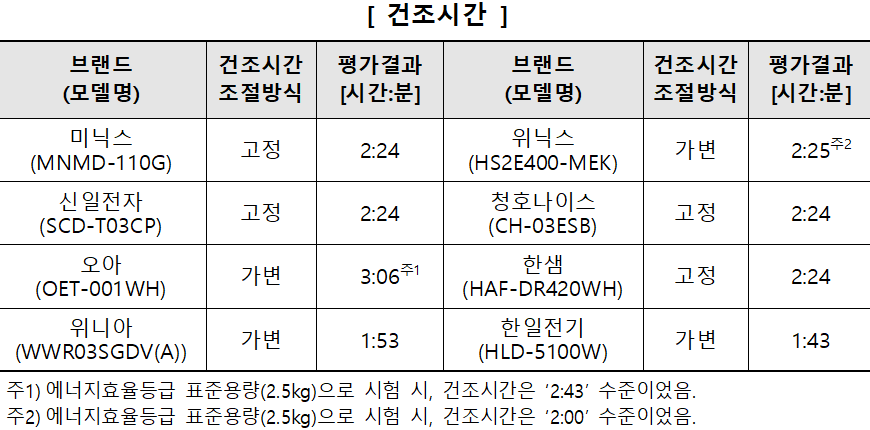 ■ 건조시간, 제품 간 최대 1시간 23분 (1시간 43분 ~ 3시간 6분) 차이 있어