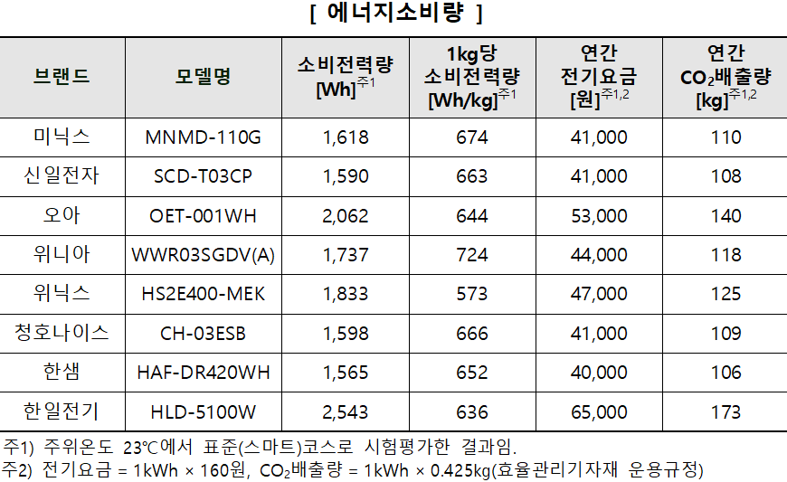 ① (소비전력량) 미닉스 (MNMD-110G), 신일전자 (SCD-T03CP), 청호나이스 (CH-03ESB), 한샘 (HAF-DR420WH) 등 4개 제품의 소비전력량이 상대적으로 적었고, 한일전기 (HLD-5100W) 제품이 가장 많았으며, 제품 간 최대 1.6배 (1,565Wh ~ 2,543Wh) 차이가 있었음.