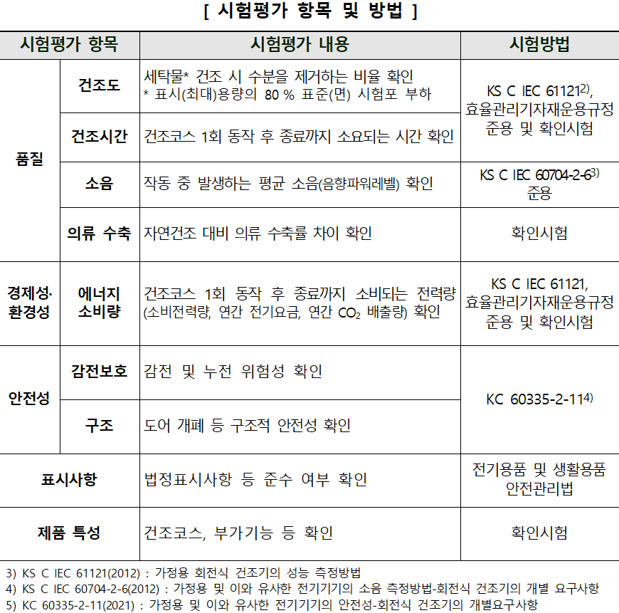 품질 (건조도, 건조시간, 소음, 의류 수축), 경제성·환경성 (에너지소비량), 안전성 (감전보호, 구조), 표시사항, 제품 특성 (부가기능 등)을 시험평가