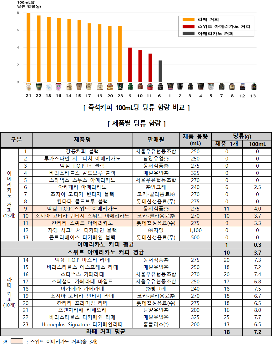 라떼, 스위트 아메리카노 커피 순으로 당류가 많이 들어있어