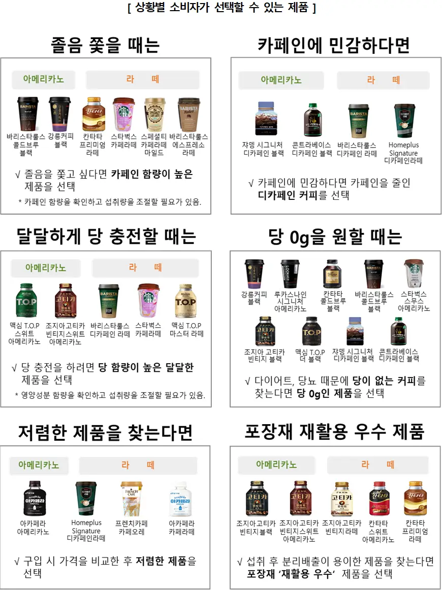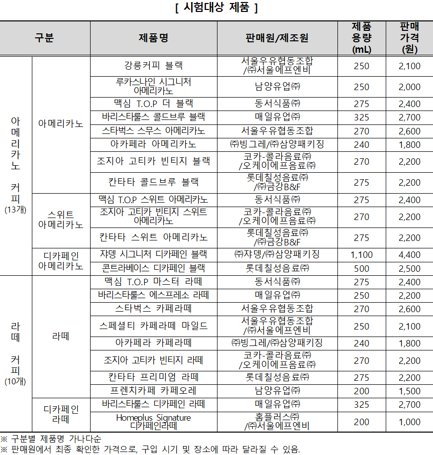 즉석커피에 대한 소비자 설문조사를 통해 선호도가 높은 아메리카노 커피 13개 (아메리카노, 스위트 아메리카노, 디카페인 아메리카노), 라떼 커피 10개 (라떼, 디카페인 라떼) 등 총 23개 제품을 선정.