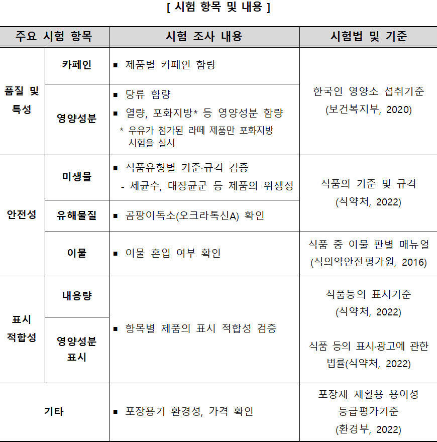 품질 (카페인, 영양성분 등), 안전성 (미생물, 오크라톡신A, 이물 등), 표시 적합성 (내용량, 영양성분 표시 등), 환경성 및 가격정보 등을 통한 제품 선택정보 제공