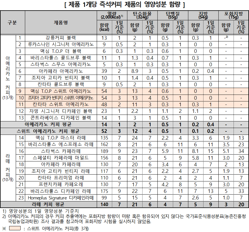 – 스위트 아메리카노 커피 3개 제품의 제품 1개당 평균 열량 (52kcal)은 1일 영양성분 기준치의 3%, 탄수화물 (12g)은 4%, 단백질 (0.5g)은 1%, 지방 (0.1g)은 0.2% 수준이었음.