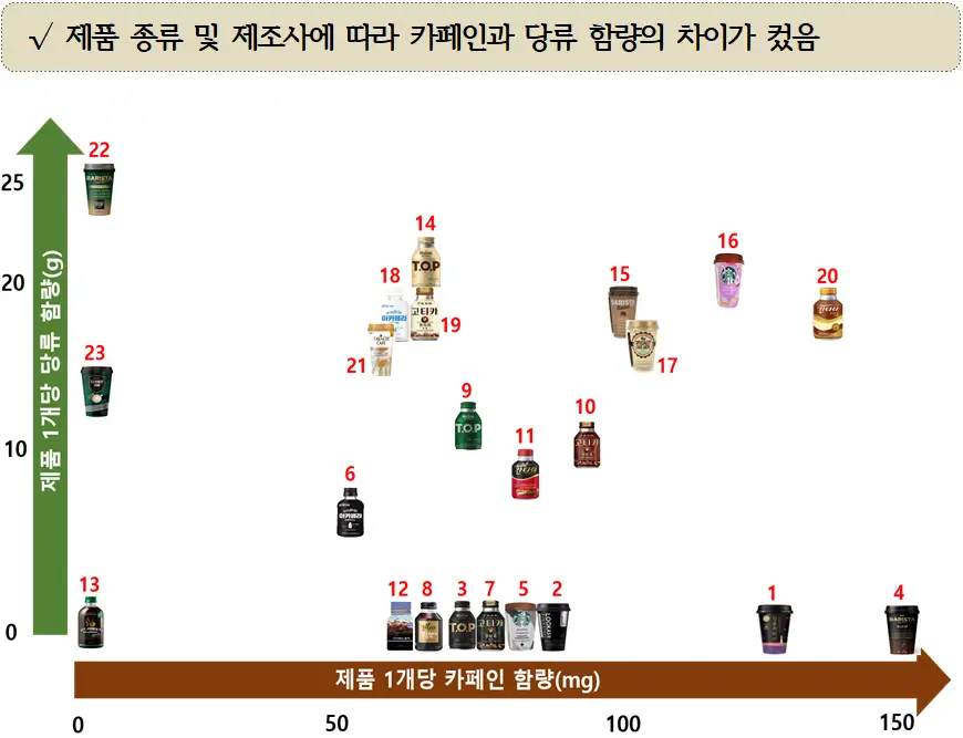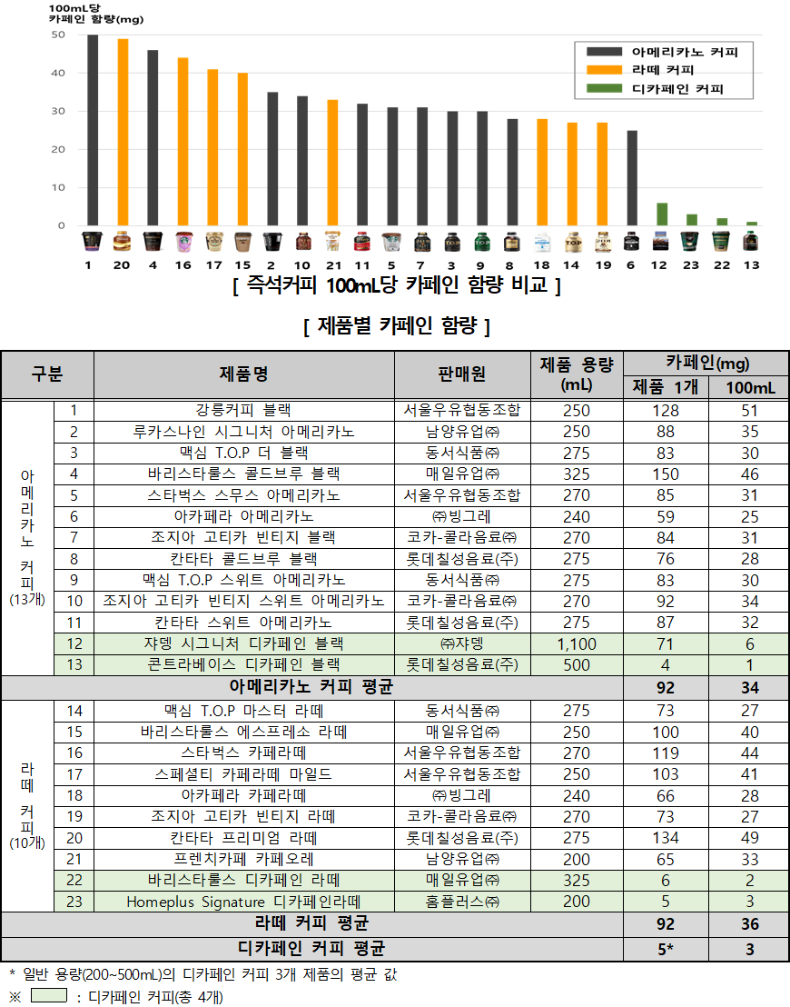 – 100mL당 카페인은 강릉커피 블랙 (서울우유협동조합) 제품이 51mg으로 가장 많았고, 콘트라베이스 디카페인 블랙 (롯데칠성음료㈜) 제품이 1mg으로 가장 적었음.