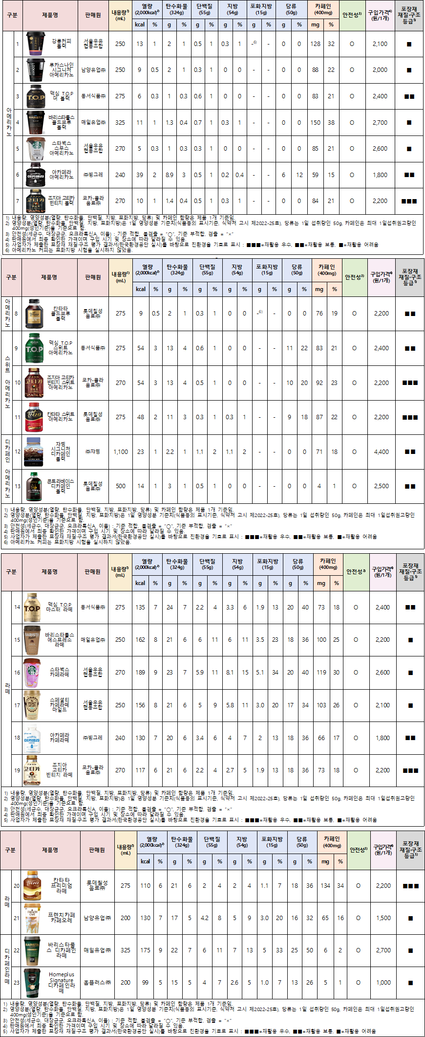 편의점, 마트 등에서 간편하게 구입할 수 있는 즉석 커피 음료의 시장규모가 꾸준히 커지고 있다. 이에 한국소비자원이 소비자에게 합리적인 상품 선택정보를 제공하기 위해 즉석커피 23개 제품을 조사한 결과, 제품 유형과 종류에 따라 카페인, 당류 및 포화지방 함량 차이가 커 제품 구입 시 영양성분을 확인하고 섭취량을 조절할 필요가 있는 것으로 나타났다.