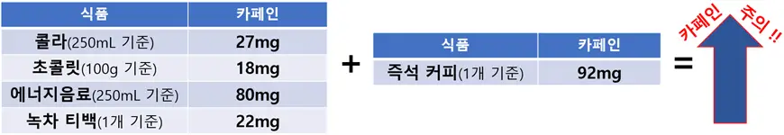 → 하루에 콜라, 초콜릿, 에너지음료 등과 함께 커피를 섭취하게 되면 카페인 과다섭취가 되므로 섭취 조절이 필요해요.