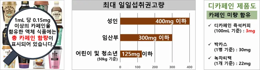 성인 400mg 이하, 임산부 300mg 이하, 어린이 및 청소년 체중 1kg당 2.5mg 이하 (‘성인 하루 커피 4잔, 청소년 에너지음료 2캔 이내로 섭취하세요’, 식품의약품안전처 2020)