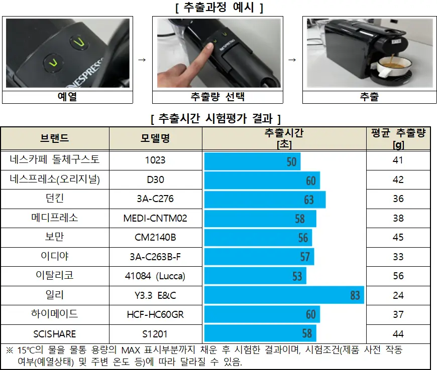 ① 캡슐커피머신의 추출량은 기본설정 (에스프레소, 룽고) 중 에스프레소를 선택해 평가하였고, 전원 공급 후 추출을 준비하는 예열시간을 포함함.