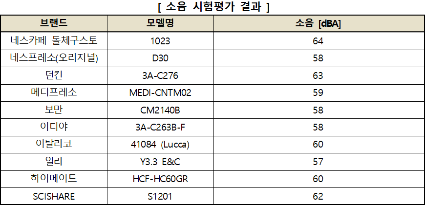 ② 네스카페 돌체구스토 (1023), 메디프레소 (MEDI-CNTM02), SCISHARE (S1201) 제품은 상대적으로 ‘우수’, 보만 (CM2140B), 일리 (Y3.3 E&C) 제품은 ‘보통’으로 평가됨.