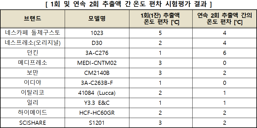 ④ (연속 2회 (2잔 간) 추출온도 편차) 연속 2회 추출액 간의 온도 편차는 제품별로 최대 6℃ 차이가 있었음.