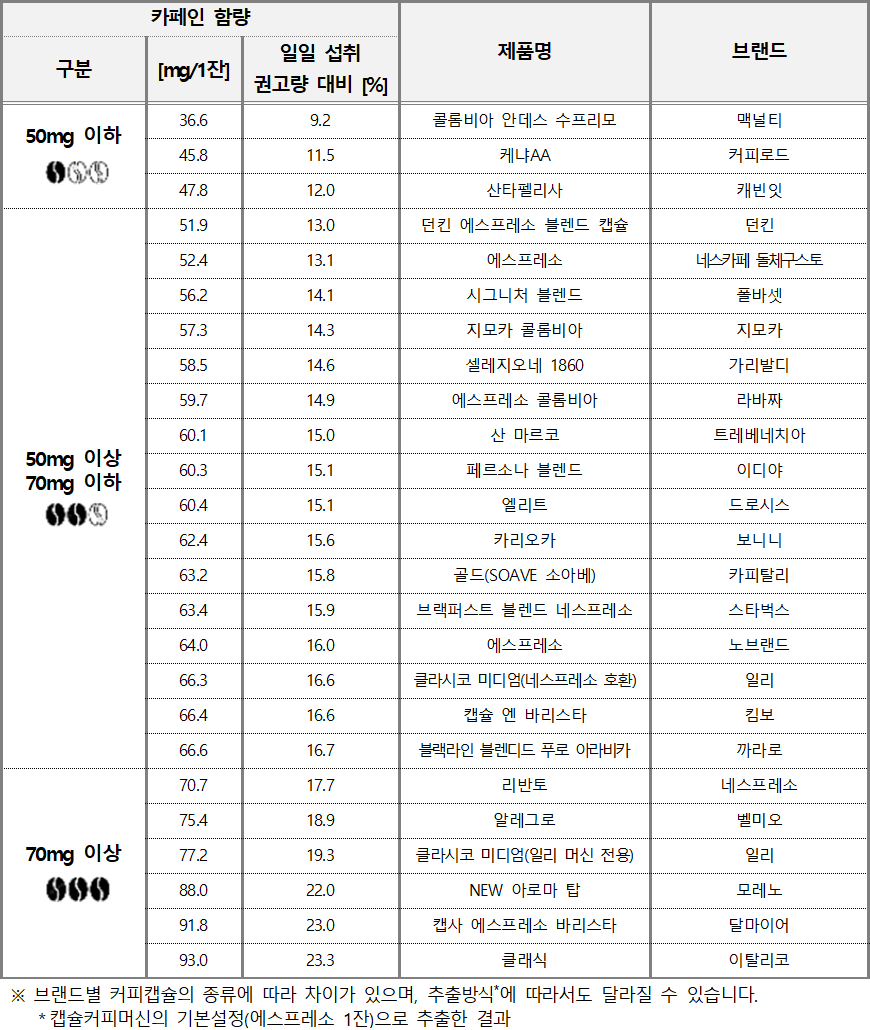 ☐ 커피캡슐 제품별 카페인 함량