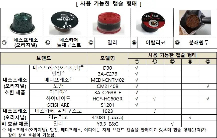 ① 8개 제품 (네스카페돌체구스토, 네스프레소 (오리지널), 던킨, 메디프레소, 이디야, 이탈리코, 일리, SCISHARE)은 캡슐 투입구에 맞는 1개 형태 (네스프레소 (오리지널), 네스카페돌체구스토, 이탈리코, 일리중1가지)의 캡슐을 사용할 수 있었음.