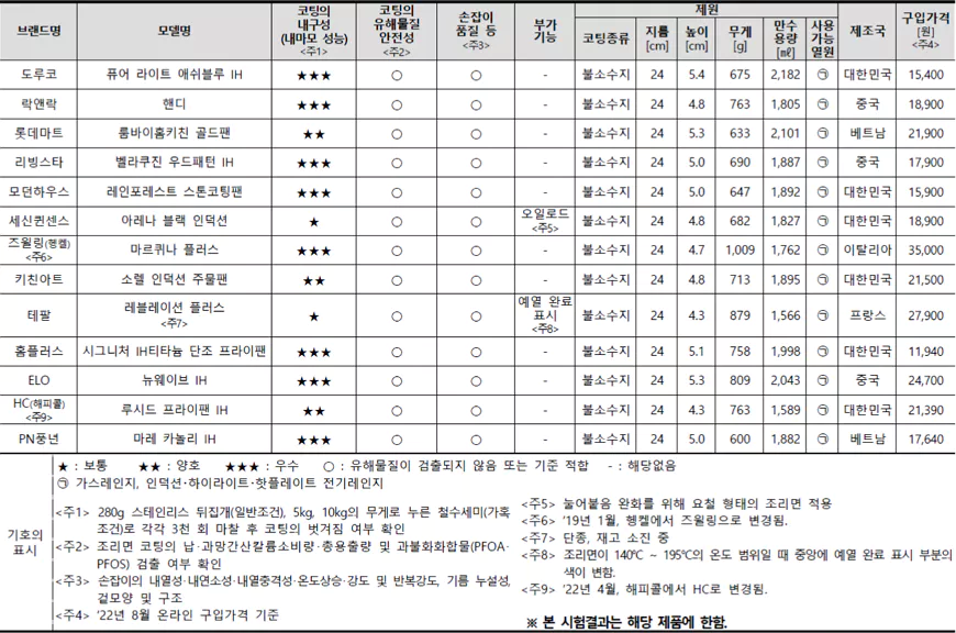 이에 한국소비자원이 주요 브랜드 프라이팬 13개 제품을 시험·평가한 결과, 전반적으로 품질이 우수하나 가장 중요한 성능인 프라이팬 조리면 코팅의 내구성 (내마모 성능)은 제품별로 차이가 있었다.