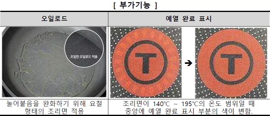 ① (부가기능) 세신퀸센스 (아레나 블랙 인덕션) 제품은 오일로드 기능이 있었고, 테팔 (레블레이션 플러스) 제품은 예열 완료 표시 기능이 있었음.
