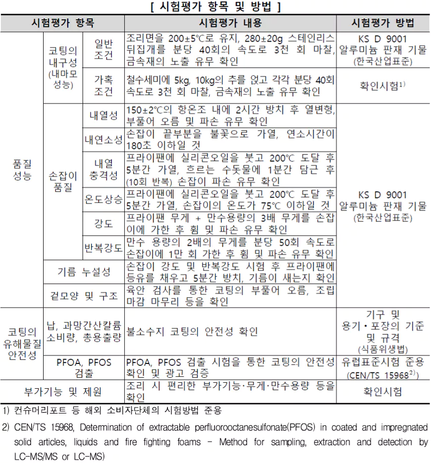 후라이팬 추천 시험평가 항목 및 방법
