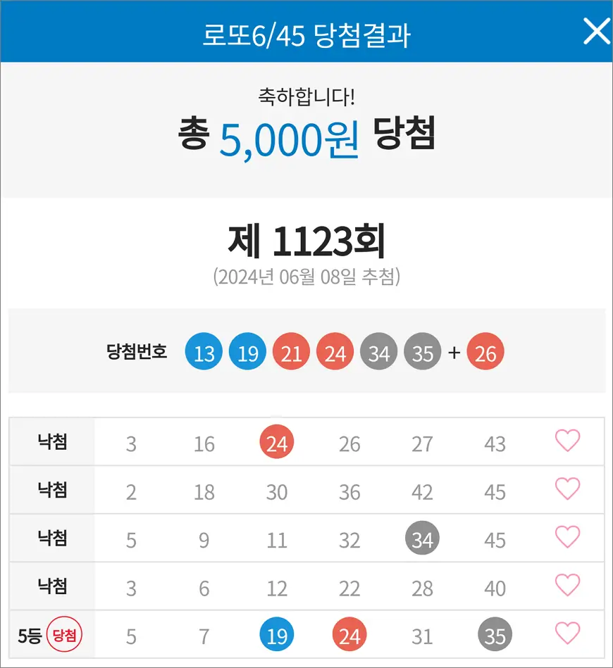 로또 1123회 당첨 5등 1장