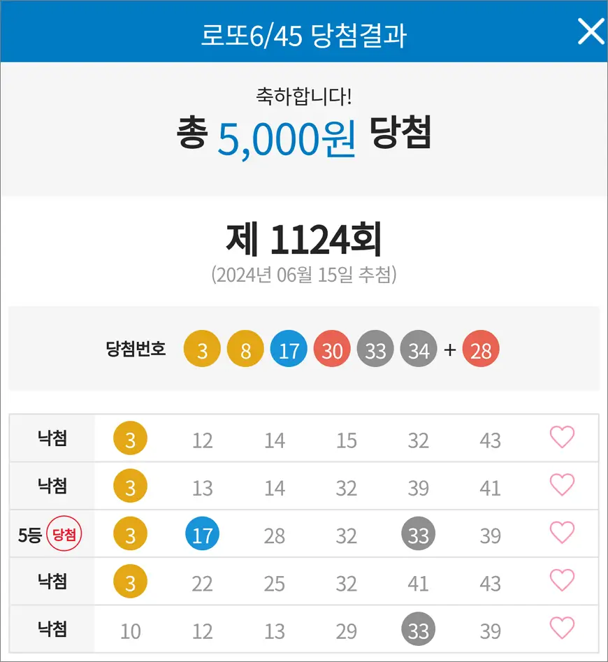 로또 1124회 당첨 5등 1장