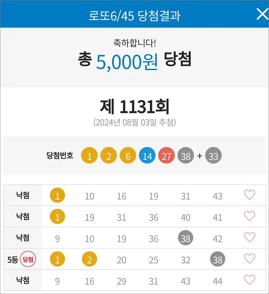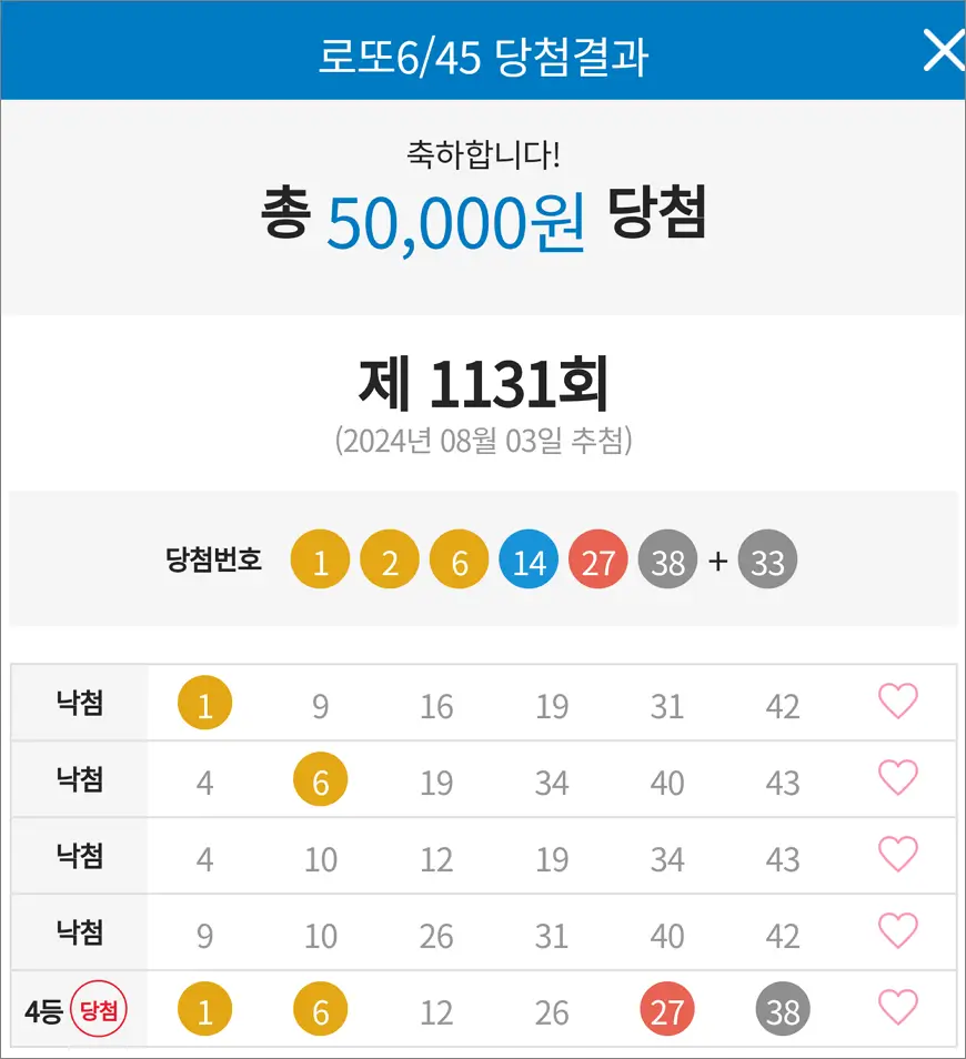 로또 1131회 당첨 4등 1장, 5등 1장