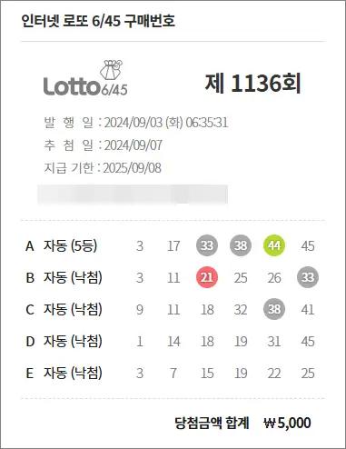 로또 1136회 당첨 5등 1장
