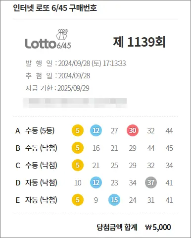로또 1139회 당첨 5등 1장