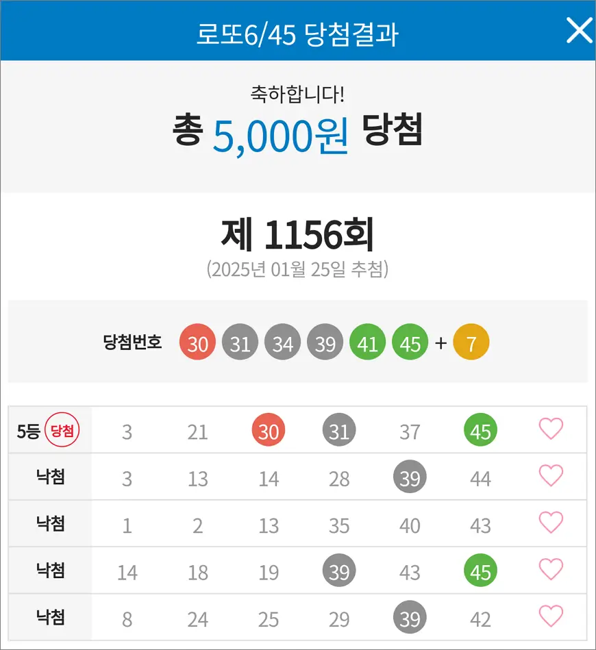 로또 1156회 당첨 5등 1장