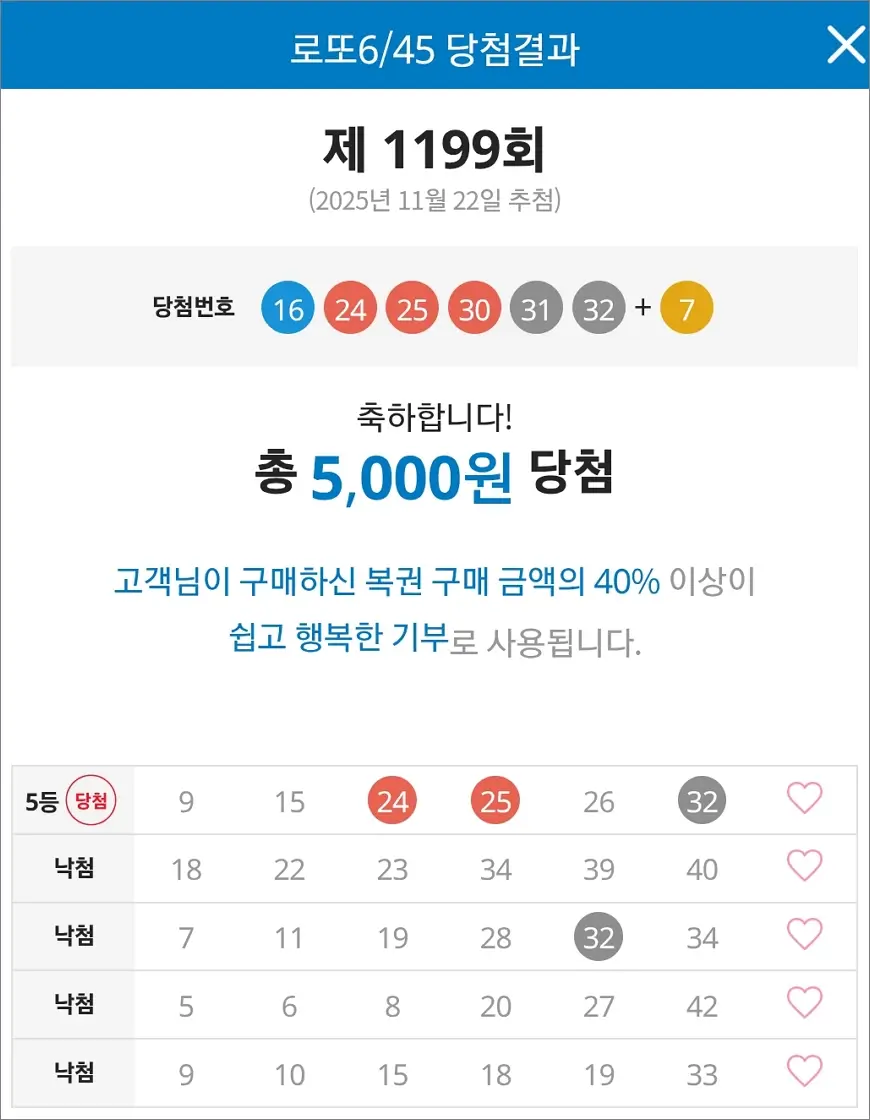 로또 1214회 당첨 4등 1장 5등 1장1개월 전