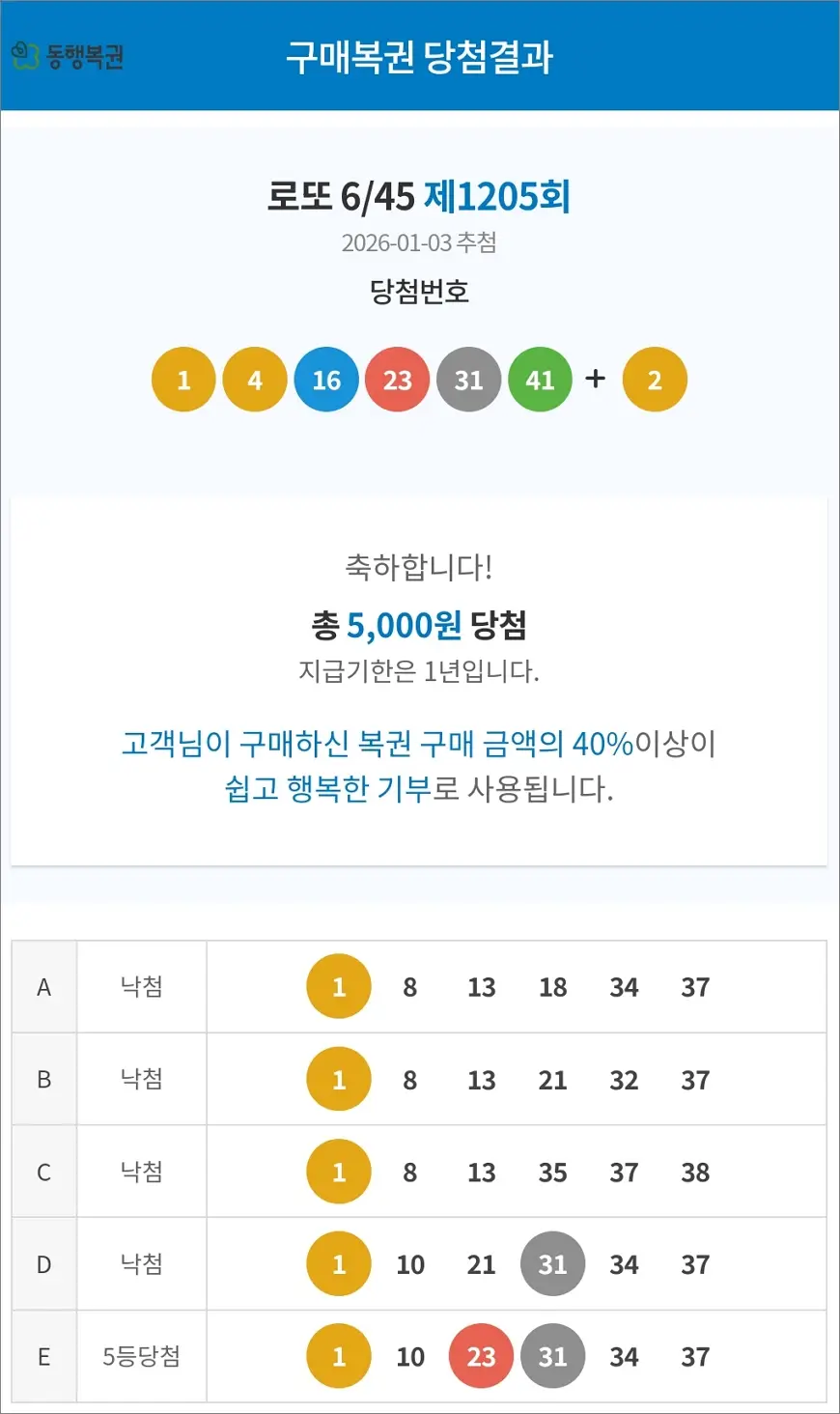로또 1205회 당첨 5등 1장