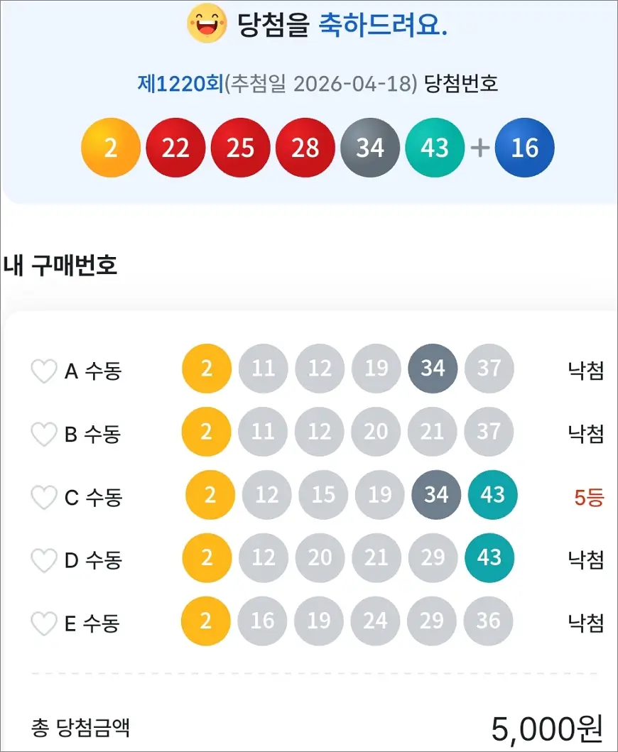 로또 1220회 당첨 5등 1장